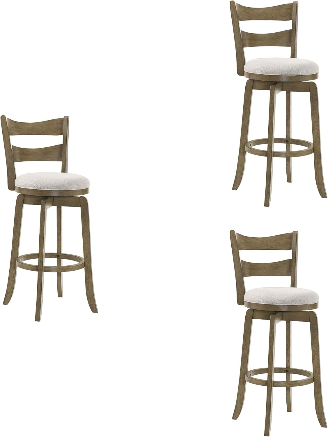 The Blair Barstool Collection brings effortless elegance and comfort to your home. Available in both counter and bar heights, each stool features a round seat upholstered in a soft, cozy fabric that adds warmth and charm to any space. Choose between a creamy neutral or fog-gray cushion, perfectly paired with either a rich putty brown or crisp matte white wood finish. Crafted with sturdy rubberwood, these barstools are designed for everyday durability and long-lasting appeal. Each piece is finished with care to highlight the natural wood grain, offering a stylish foundation that blends beautifully with a wide range of interior styles. The smooth 360-degree swivel feature offers effortless mobility, ideal for entertaining or everyday use. No arms and a built-in footrest make these stools practical and easy to tuck under counters. From casual mornings to lively evenings, the Blair Barstool adds an inviting touch to your dining or gathering spaces. This product includes two barstools.