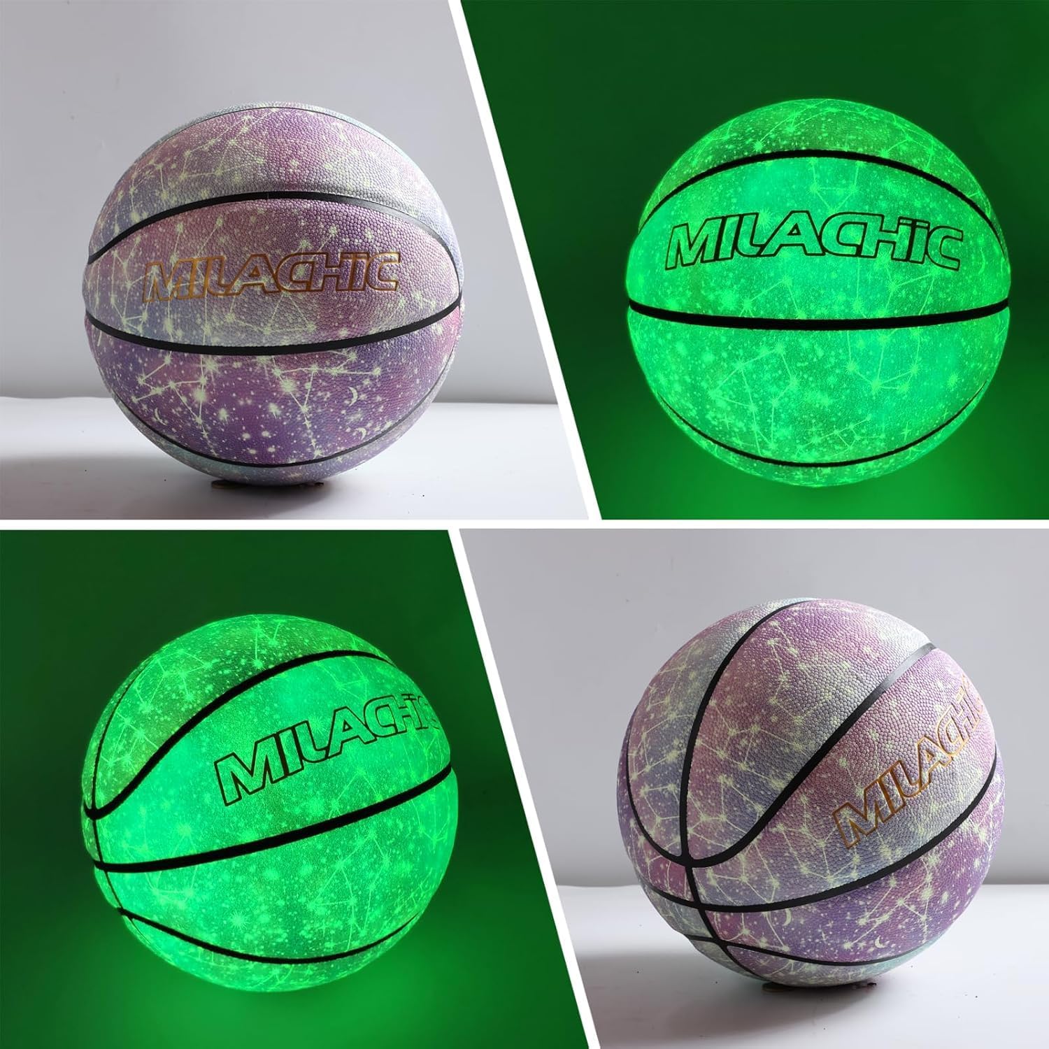 MILACHIC glow in the dark basketball for teenagers men women Why Choose MILACHIC Glow in the Dark Basketballs? 1.Premium-quality basketball. 2.Best and reliable service for you. 3.The carefully selected materials and exquisite craft ensure the durability of basketballs for daily use. How does glowing basketball work? This fluorescent glow-in-the-dark basketball does not need any batteries, only needs to put the basketball under the sunshine or other strong light for a while, the illuminated basketball will glow in the dark naturally. And the stronger and longer time sunshine or other strong light will make the basketball glows brighter and keeps longer in dark. ❤Made with durable, hygroscopic PU leather for excellent grip. ❤Suitable for all kinds of indoor & outdoor floors, such as the synthetic court, cement floor, concrete floor, rubber floor, wooden floor, etc. ❤Butyl rubber bladder for excellent air and shape retention ❤Size 5/27.5" for teenagers; Intermediate-size 6 (Women size)/28.5" for adult women; Official size 7/ 29.5" for adult men❤❤Please note that all basketballs are shipped deflated to ensure safety on transport, you can inflate it by air pump before use. Please lubricate the ball needles before inflating.