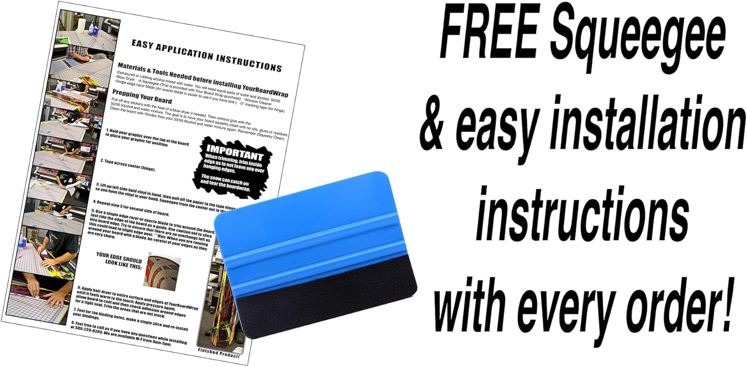 Need a professional-looking custom snowboard wrap kit? Look no further! Our kits include a standard-sized 14” x 65” snowboard wrap print, an application squeegee, and easy-to-follow installation instructions. Our unique and one-of-a-kind designs are perfect for those who want to revamp their snowboard graphics. Our snowboard wraps also offer a great solution for recycling your existing snowboard. Our special cold-weather vinyl and protective gloss UV laminate will protect your snowboard from harsh winter elements. Our time-tested formulated wrap materials make it a breeze to remove and change designs as often as you want. This is especially helpful if you want to switch up your look from season to season. Order now for the ultimate snowboarding experience! Please note that this kit does not include the actual snowboard. Our snowboard templates are standard size 14" x 65". Only for use on the top of your board — NOT THE BOTTOM. Your snowboard wrap may look different that what is pictured.
