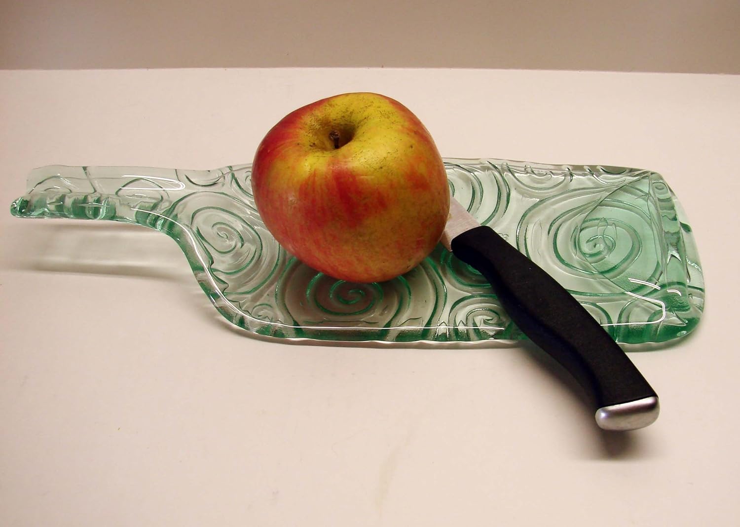 This is a green tint 750 ml wine bottle that I flattened onto a swirl textured mold in my kiln that left the neck part raised for serving ease. It can be used as a cheese board, as a small cutting board for your bar, a utensil rest or as a candle holder. Dimensions Approx. 12 by 4 1/2 inches