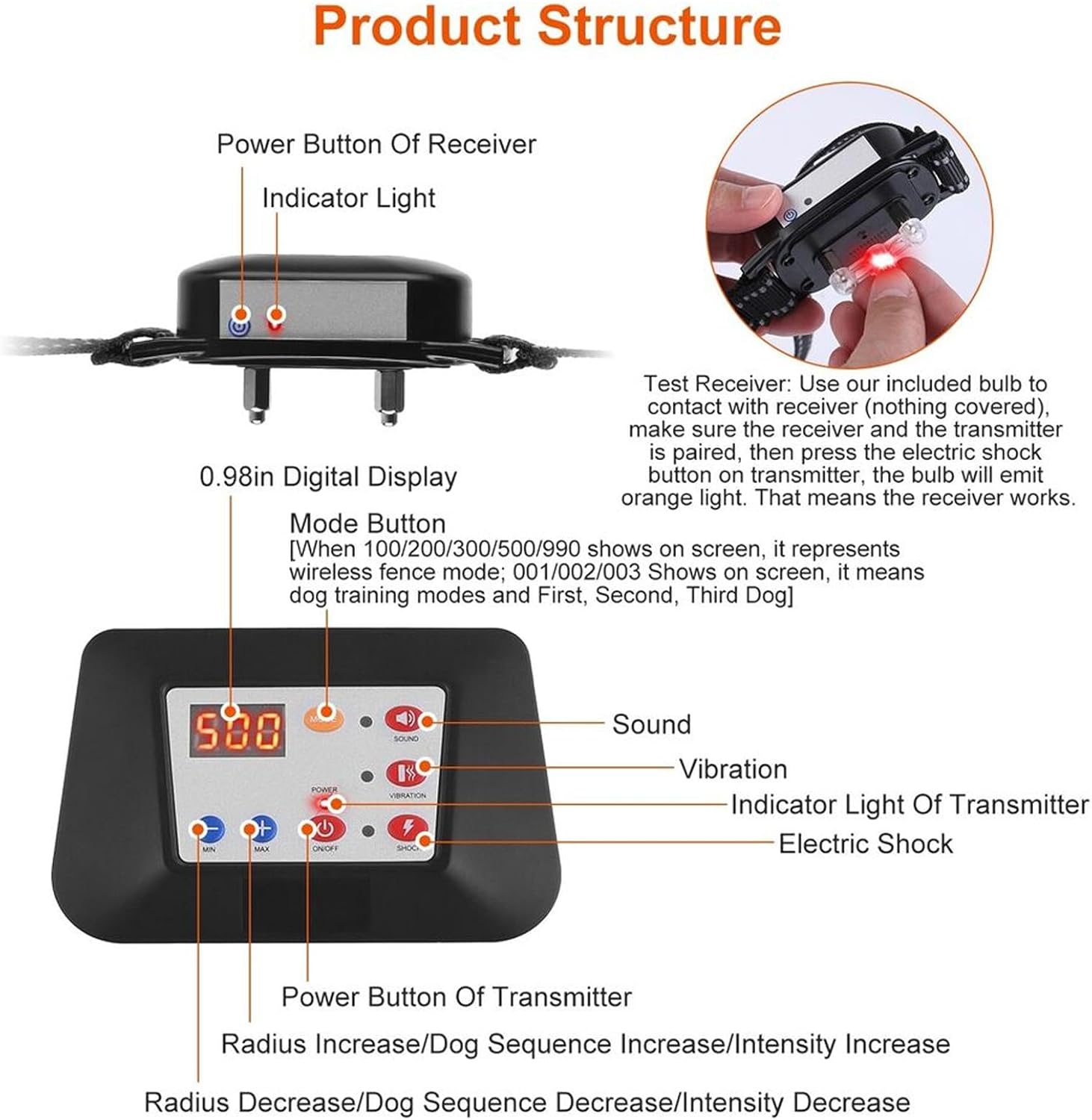 Product descriptionThis Wireless Dog Fence System is a 2 in 1 Electronic Pet Training Collar with 3 Working Modes Waterproof Rechargeable Pet Containment System Boundary ContainerThe two-in-one electronic wireless fence dog trainer has a novel appearance and a comfortable feel. What's more worth mentioning is that it integrates a dog trainer and a wireless electronic fence. The operation is simple and the mode switching is convenient, allowing pets to obtain better results within a limited range.Product specifications:Material: High-quality materialsColour: Blackweight:300g/0.66lbThe package includes:1/2/3x Rechargeable Collar Receiver1x Rechargeable Transmitter1x USB Cable4 x Metal Contact1 x Test Light4 x Safe Silicon CapNote:The light and different display in photography may cause the color of the item in the picture to be slightly different from the actual object. The allowable measurement error is +/- 1-3cm.