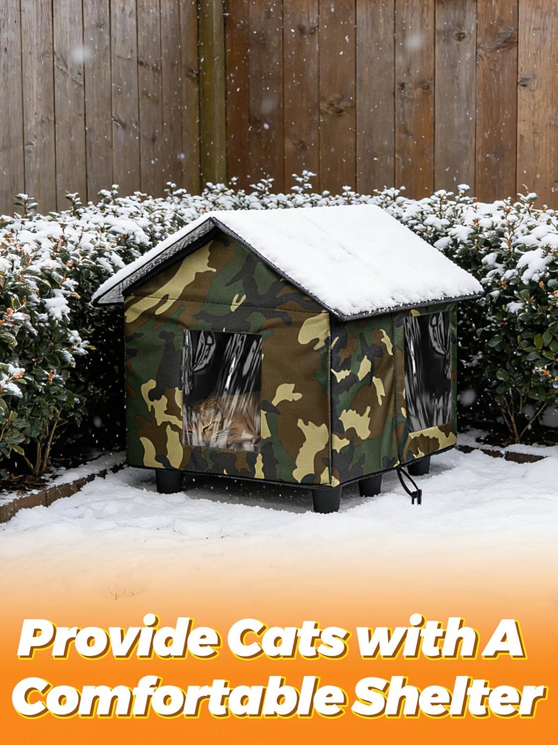 • Sturdy and Durable: Custom-made with Oxford cloth and PP board, the roof and walls are connected by zippers, and ground stakes are used to secure the house. Thickened legs enhance load-bearing capacity and effectively protect against rain and snow, ensuring cats have a warm shelter in cold weather.