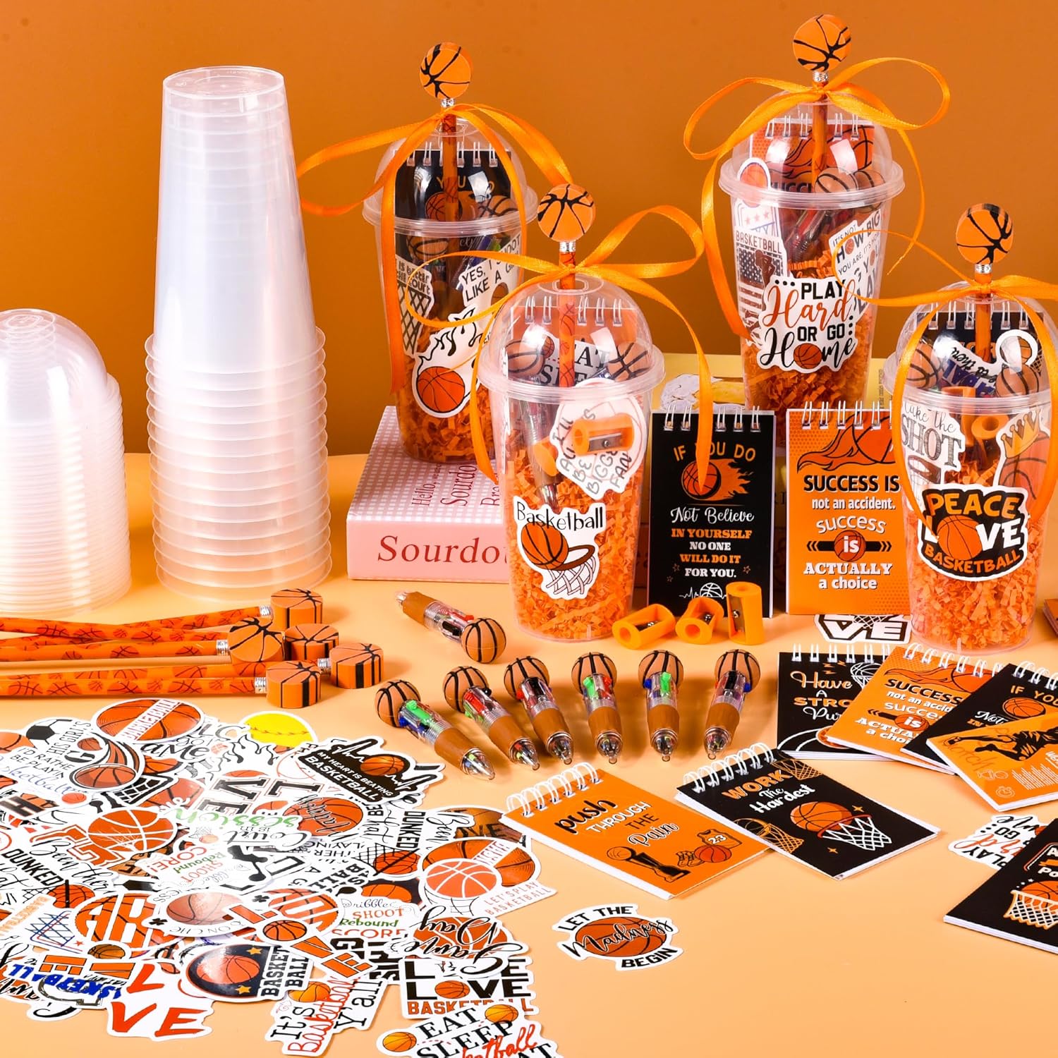 A Large Quantity of basketball Party Supplies: Our basketball party return gifts include 24 basketball pencils, 24 mini notebooks, 24 4-in-1 pens, 100 animal stickers and 24 pencil sharpeners. These diverse range of stationery make this gifts set of products an ideal choice for teachers' prizes and basketball party presents Reliable Materials: The fillers of basketball goody bags for kids are mainly made of high-quality paper, wood and plastic, which are non-toxic, safe and strong. It meets your child's usage needs in various occasions and can also be shared with friends or classmates. They are both interesting and practical. You can exchange these beautiful items as basketball party gifts or classroom gifts for your classmates or children to stimulate creativity and attention. Reusable Multi-purpose Cups: The basketball gift set offers you 24 plastic cups with LIDS, which can be used to hold beverages. Besides, you can put all the small gifts in the cups and turn them into interesting gifts. You can assemble the gifts with your children and experience the fun of DIY gift packaging. Give these assembled "cup gifts" to your friends attending the birthday party. Ideal Pinata Goodie Gift Bag: You can use these stationery cup gifts as classroom exchange class reward prizes. The stationery sets have various cartoon designs elements, which are more in line with students' preferences. Cute and interesting stationery can add fun to daily study and stimulate children's interest in learning. Our multi-element stationery gift cups will be widely loved by students. Wide Application Range: Our stationery party return gifts can be used as holiday presents, game prizes, party supplies, and school classroom rewards. For basketball parties or family gatherings, Pinata candies, classroom competition prizes, can bring more joy to classroom gatherings and daily studies. Whether you are a teacher looking for prizes, a parent planning a party, or simply someone who loves basketball or birthdays, these gifts are all suitable. They can be given as gifts for parties and decorations to meet your needs.